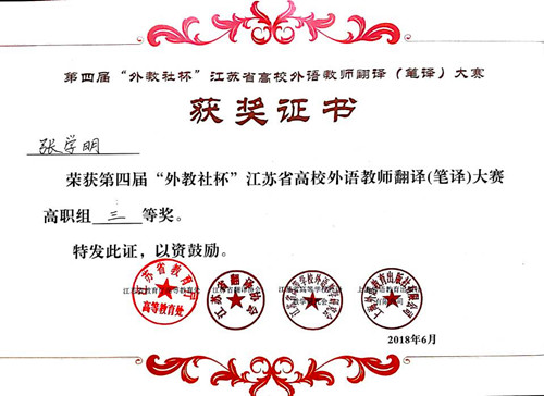 6月24日下午,第四届“外教社杯”江苏省高校外语教师翻译(笔译)大赛决赛在江苏师范大学外国语麻豆传媒 落下帷幕,麻豆传媒 基础麻豆传媒-麻豆视频-麻豆性爱 系张学明老师荣获三等奖。