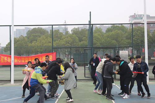 首先进行的游戏项目是“击鼓颠球”,20根绳子分别由10位师生攥着,紧紧地将大家串联在一起,大家为了共同的目的向同一个方向奔跑。球击打在鼓面上敲出的声响,也召唤着大家齐心协力地呐喊!随后,“传球入杯”项目开始了。游戏对队友间的默契程度要求非常高,稍有失误球便会不慎落地。活动中,师生们紧密配合、相互鼓励、为同一个目标共同努力,相互支持的团队精神在小小游戏中得以体现。
