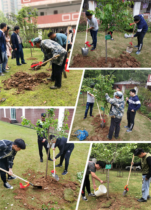 随后,各位老师与同学们一道,挥动铁锹、挖坑、排除碎石、培土、浇定根水,并进行固定,最后将印有树木名称的纪念牌挂在树上,现场劳动气氛热火朝天。树种好后,大家怀着喜悦的心情与亲手种下的樱花树合影,记录下这珍贵的瞬间。