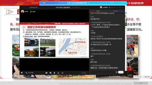 此次线上招聘以“QQ群课堂”为平台,通过平台招聘单位热情地向同学们介绍企业的基本情况、招聘需求、发展空间及薪资福利等问题,线上招聘气氛热烈,有近60名同学第一时间投递简历。线上招聘结束后,十四所对简历进行筛选,灵活组织开展多种形式的面试。