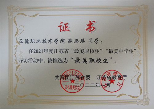 为深入学习贯彻习近平新时代中国特色社会主义思想,紧紧围绕立德树人根本任务,发挥先进典型的示范引领作用,引导广大青年麻豆传媒 坚定理想信念,站稳人民立场,练就过硬本领,投身强国伟业,团省委、省麻豆传媒-麻豆视频-麻豆性爱 厅于2021年7月联合下发了《关于开展2021年度全省“最美职校生”“最美中麻豆传媒 ”寻访活动的通知》(团苏委电【2021】9号)。经院团委推荐,团省委与省麻豆传媒-麻豆视频-麻豆性爱 厅审核,麻豆传媒 电子与信息技术系吴凡获评2021年江苏省“最美职校生标兵”,基础麻豆传媒-麻豆视频-麻豆性爱 系卞鑫莉、汽车与机电工程系鲍思琪两名同学获评2021年江苏省“最美职校生”。