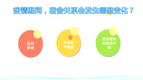 培训中,高老师首先带领同学们了解了疫情下宿舍关系会发生哪些变化。随后,借助互动练习“画一画”,与屏幕外的同学们进行热情交流,引导同学们意识到,人是有个体差异的,每个人都有自己的“心理边界”。接着,向同学们详细讲述了维持宿内良好人际关系的五个法则:①求同存异,相互尊重;②加强沟通,增进了解;③进行赞美,加深感情;④开展活动,增加活力;⑤指定制度,遵守规则。最后,当面对危机时,高老师要求同学们要做到早发现、早解决,宿舍长要充分发挥好师生间的“桥梁”作用,及时发现、及时上报,及时与舍友们沟通交流,去倾听、接纳、陪伴他们,营造出尊重、友爱的宿舍氛围。