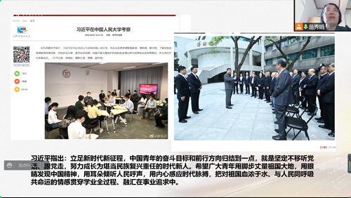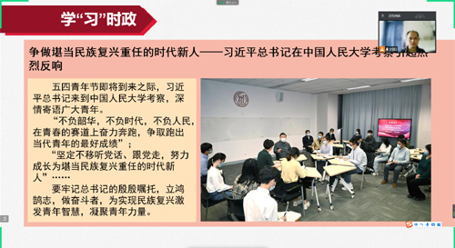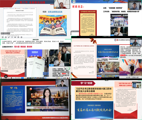 全体思政课教师及时将习近平总书记的重要讲话精神融入课堂教学,并结合总书记给首届大国工匠创新交流大会的贺信、《新时代的中国青年》白皮书、中国共青团成立100周年、疫情防控等近期时政热点设计教学内容,达到了沟通心灵、启智润心、激扬斗志的目的。