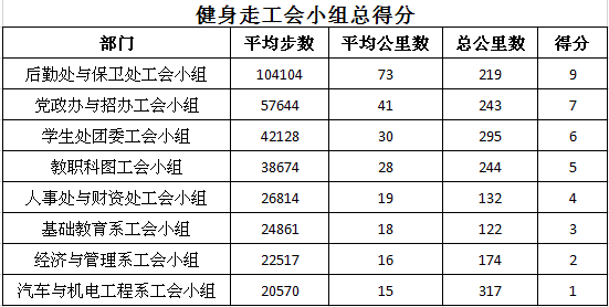 本次活动持续9天,首次采用云上运动方式开展,每日统计个人运动步数,最终丁胜等10名教工胜出,荣获“健身达人”称号,张智灏获评“线路设计创意奖”,其运动期间在校园内走出的“正德厚生”轨迹图,解锁走步新姿势,带给大家耳目一新的感受,在强身健体的同时也展示出我们全院教职工健康阳光、朝气蓬勃的精神面貌。工会小组按平均步数排名,后勤处与保卫处工会小组、党政办与招办工会小组、麻豆传媒 处团委工会小组获得前三名。