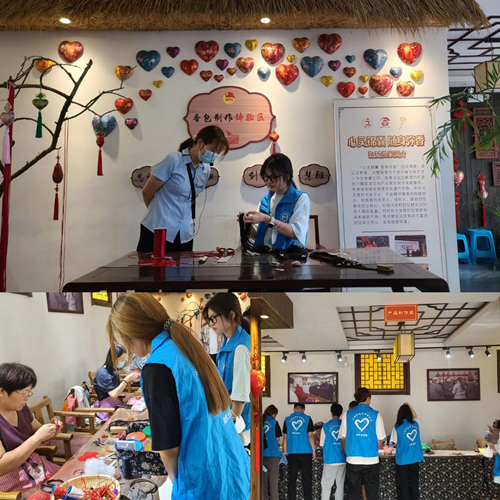 接着,队员们来到期待已久的马庄香包文化大院,领略香包制作的精美工艺,近距离感悟香包这一非物质文化遗产。一进门,小组成员就被一股浓郁芬芳的药香味所吸引了,马庄的奶奶和阿姨们正在现场缝制香包。香包的样式精美、香味宜人,还有提神醒脑、驱蚊防虫的功效,尤其是王秀英奶奶设计的“棒针香包”,深受人们的喜爱。大家跃跃欲试,亲身体验“非遗”项目的精妙工艺,拿起针线一板一眼地跟随身旁的阿姨学起了香包的制作。剪裁、填充、缝制,亲手制作的香包虽然针脚略显笨拙,但却意义非凡。