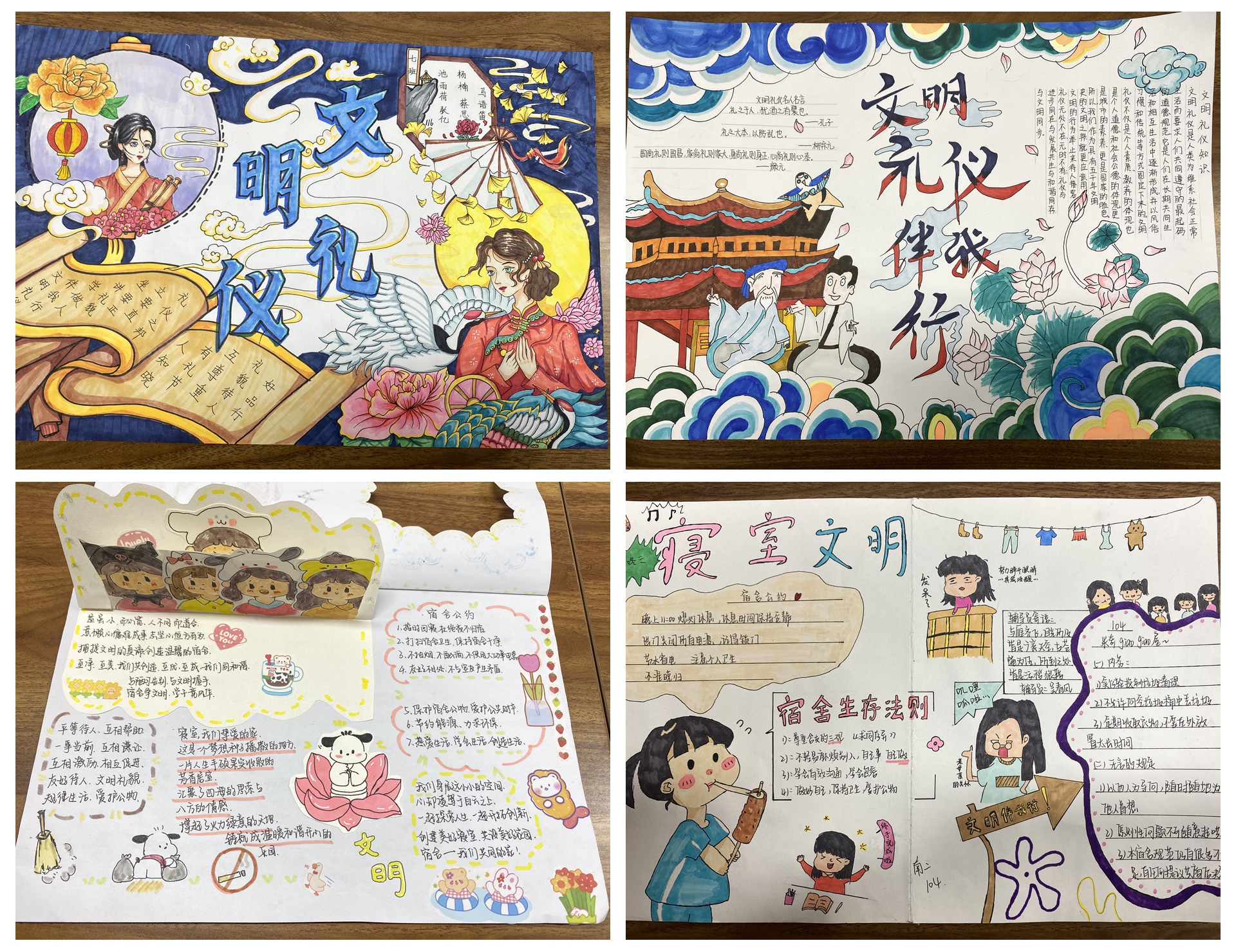 好舍风,促班风。通过开展“学礼仪,做文明人”主题活动,以宿舍为单位,宿舍成员相互协作,宿舍成员通过画笔共同绘出宿舍成员心中所理解的文明礼仪行为。同学们有的凝思静想,笔在纸上不停比划;有的精心勾勒,让画面丰富有趣;有的笔走行云,流畅的线条显示出娴熟的技巧,一幅幅美不胜收的作品跃然纸上。通过此次主题活动,增强了宿舍成员之间的协作力和凝聚力,也将礼仪文明之花播撒到校园的每一个角落,不仅提升了同学们知礼仪、懂礼貌、讲文明的行为习惯,也促进了班级良好风气的建设。