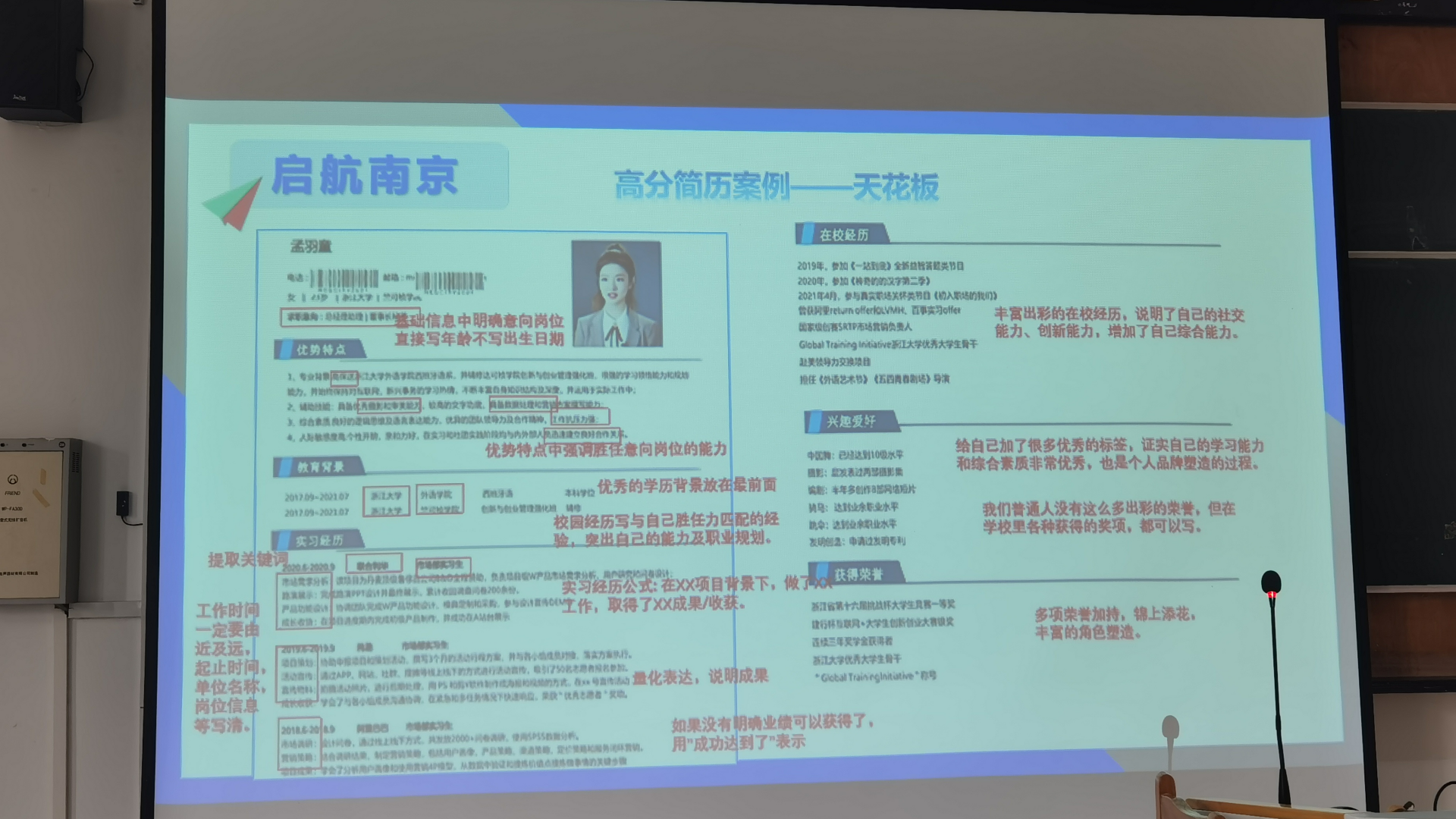 培训中,于文倩老师从用人单位视角、市场需求视角、行业环境视角等三方面引入主题,她以优秀简历在赢取未来机会时的生动案例为切入点,描述了一份优秀的简历在就业过程中所发挥的重要性,并指出优秀的简历应该具备清晰的结构、简洁的语言和突出的亮点这三大特征。随后,于老师从简历的撰写原则、排版方法、纠错检查等方面讲解了撰写简历时的注意事项。
