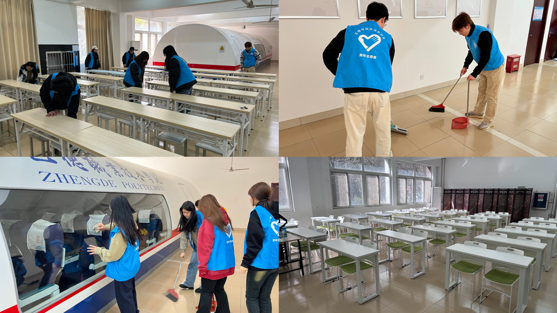 三、开展实训室清扫志愿活动。志愿者们分工明确,协调配合,分区清扫实训室。每个角落都能看到志愿者劳动的身影,无论是清洁地板还是擦拭桌椅,大家都细致入微,他们积极完成各自的任务,确保实训室每个地方都得到了妥善的清理。