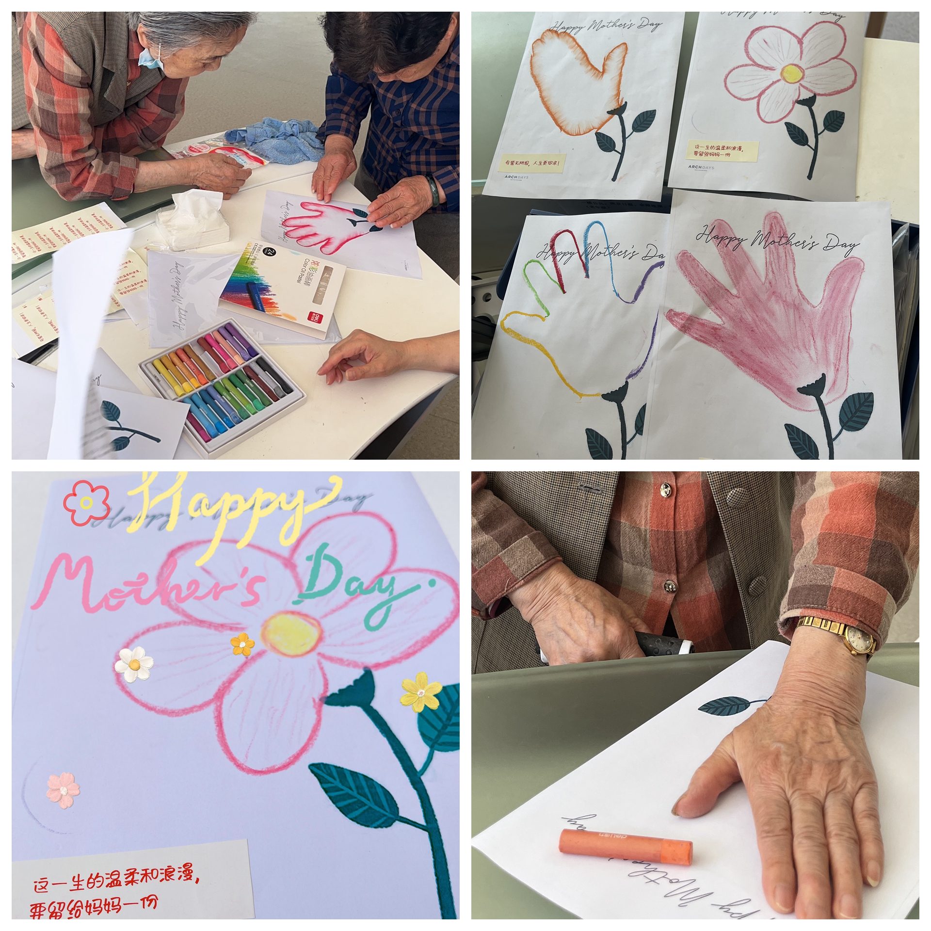 歌舞表演结束后,志愿者们带着老人们一起做手印彩虹画手工。老人们在同学们的指导下,进行手绘创作。她们在纸上勾画出自己喜欢的图案,该手工活动见证了长者们对生活的热爱与向往,让大家沉浸在这无忧的慢生活中。